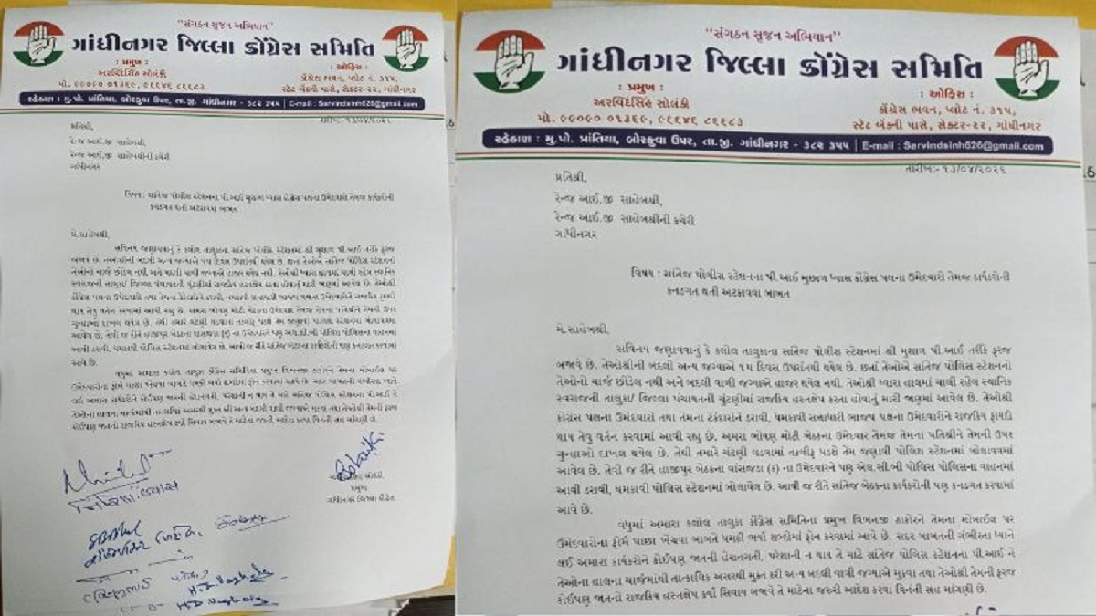 ગાંધીનગર જિલ્લા કોંગ્રેસ પ્રમુખ અરવિંદસિંહ સોલંકી અને મહેસાણા જિલ્લા પ્રમુખ બળદેવજી ઠાકોરે જણાવ્યું હતું કે, કલોલ તાલુકા પંચાયત અને જિલ્લા પંચાયતની ચૂંટણીમાં પી.આઈ. મુછાળ દ્વારા કોંગ્રેસના કાર્યકરોને ખોટી રીતે હેરાન કરવામાં આવી રહ્યા છે. ભોયણ અને હાજીપુર બેઠકના કોંગ્રેસના ઉમેદવારોને પોલીસ સ્ટેશન બોલાવીને દબાણ લાવવામાં આવે છે. એટલું જ નહીં, કલોલ તાલુકા કોંગ્રેસ પ્રમુખ વિભનજી ઠાકોરને ફોન પર ધમકીઓ અપાઈ હોવાનો પણ પત્રમાં સનસનીખેજ દાવો કરાયો છે.
