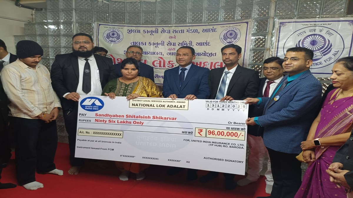 તારીખ ૧૩/૧૨/૨૦૨૫ના રોજ આયોજિત નેશનલ લોક અદાલત (National Lok Adalat) દરમિયાન આ કેસનો ઉકેલ લાવવામાં આવ્યો. આ કેસમાં વીમા કંપની યુનાઇટેડ ઇન્ડિયા ઇન્સ્યોરન્સ કંપની દ્વારા સમાધાનની તૈયારી દર્શાવવામાં આવી હતી. લાંબી કાનૂની પ્રક્રિયાઓને ટાળીને, વીમા કંપની દ્વારા મૃતક PSI શીતલસિંહ સીકરવારના પરિવારને સમાધાન પેટે કુલ રૂપિયા ૯૬,૦૦,૦૦૦/- (છન્નું લાખ રૂપિયા)ની માતબર રકમનો ચેક અર્પણ કરવામાં આવ્યો છે. આ સમાધાનની રકમ PSIના પરિવાર માટે આર્થિક ટેકો (Financial Support) પૂરો પાડશે.