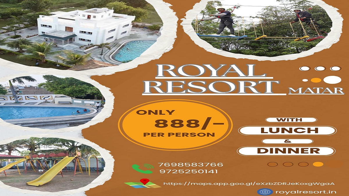 શહેરની દોડધામ અને કોલાહલથી કંટાળી ગયેલા, પ્રકૃતિના ખોળામાં શાંતિ અને નવી ઊર્જાની શોધ કરતા સૌ કોઈને ‘ધ રોયલ રિસોર્ટ’ નું હાર્દિક આમંત્રણ છે. અમદાવાદથી માત્ર એક કલાકના ટૂંકા અંતરે સ્થિત આ શાંતિધામ તમારા માટે લાવ્યું છે. તમારા માટે નજીવા દરે એક યાદગાર વન-ડે પિકનિકનો ભવ્ય અનુભવ, જેમાં સ્વાદિષ્ટ નાસ્તો, ભવ્ય બપોરનું ભોજન (લંચ) અને સાંજની હાઇ-ટીનો સમાવેશ થાય છે. અહીંના લીલાછમ વાતાવરણની તાજગીસભર હવા તમારા મન અને તનને તરત જ શાંતિનો અહેસાસ કરાવશે, જ્યારે વિશાળ સ્વિમિંગ પૂલ, ખુલ્લા મેદાનો અને ઇન્ડોર ગેમ્સ ઝોન તમારા દિવસને ઉત્સાહથી ભરી દેશે.